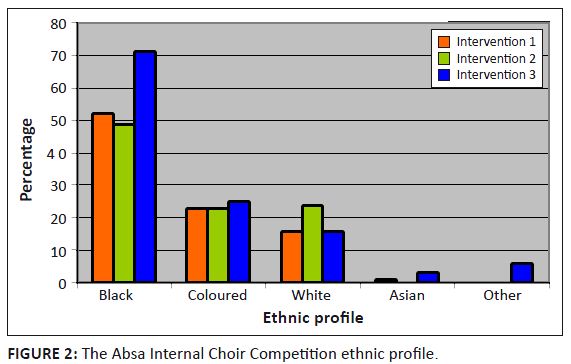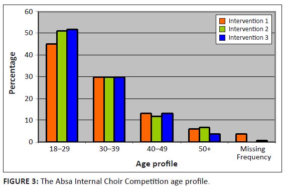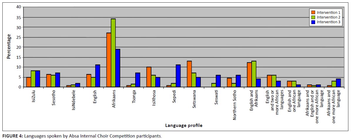 A recent study into the generic music style preferences of urban South African adolescents living in Johannesburg revealed that students from all socio-economic strata more often than not indicated a preference for Western choral music; moreover, more students indicated a preference for Western choral music rather than rock music (Matthews 2011:160). Figure 3 shows that Absa employees between the ages of 18 and 29 found participating in choral singing appealing.All South African languages are represented in the AICC. AICC participants who indicated that they could speak an African language (excluding Afrikaans) as well as English