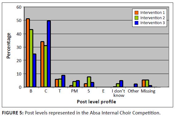 Most participants are employed at levels B (Entry Level) and C (Next Level). Between 2006 and 2008 there was an increase in participants from the higher post levels, namely C, T (Junior Management) and PM (Middle Management). Every year, amidst the disparity amongst its members, each aspiring choir embarked on a unique journey in the pursuit of becoming the winning Absa choir. Ultimately, each choir’s achievement was that of their province and when a choir won, their entire province would share in the victory.