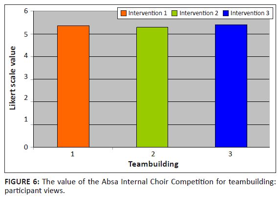 Developing the intricate listening and sensitive music skills as described by Chesnokov demands regular practice over an extended period of time. When an Absa employee became a member of an AICC choir, he or she committed to a challenging and at times cumbersome process. Over a period of six to seven months they had to attend choir practices of two to three hours every week. Taking a taxi or driving through peak time traffic after a full day’s work, week after week, required endurance and discipline. Members of a choir often lived in different towns or regions (in the Northern Cape as far as 700 km apart) and had to travel for long distances (and many hours) to attend choir practices. The resolve to win the competition for their province was clearly a major driving force. AICC participants sacrificed significant amounts of personal time every week (usually evenings and weekends) and money (expenses such as travel, choir uniform and substitute caregivers for children) to attend practices.Tuckman and Jensen (1977:419) identified five stages in team development.2 The researcher worked closely with 24 to 28 Absa choirs across South Africa from 2007 to 2010. It was interesting to observe the journey of the groups of Absa employees as they developed into choirs through the different stages leading up to adjournment, where members always expressed a sense of sadness and loss because the time with their ‘choir family’ had come to an end. AICC choir members democratically elected choir conductors, chose the material for the own choice item and designed the choir uniform. When forty choir members of dissimilar religions, races, cultures, beliefs, language and age groups have to debate the desirability or suitability of songs, dance movements and costume designs, conflict is unavoidable. However, the commitment to the choir’s achievement in the final competition, and the members’ love of singing always aided choirs to manoeuvre their team through storming to norming and finally to performing. The dedication of Absa choir members to their choirs was astounding. One example of this dedication was a young female member of the Northern Cape choir hitch-hiking more than 700 km one Saturday night to attend a choir practice on Sunday morning. Her motivation was simply: ‘I had to be here, I belong to this choir and I could not let them down.’ It was evident that the sense of belonging to a community had provided this young woman with a sense of purpose relating to the AICC. The sense of purpose and community generated through the AICC is echoed in the results of studies of the benefits of choral singing elsewhere. Clift and Hancox (2007:204) reported that the vast majority of the 1124 respondents in an extensive cross-national choral survey attributed an increased sense of coherence and community to choral singing, with 87% of respondents reporting social benefits. Findings of a survey amongst multi-cultural South African university choirs revealed that choir members experienced a genuine sense of community in their (multi-cultural) choirs (Barrett 2007:53). The quantitative data of the survey of the value of the AICC for teambuilding in Absa are presented in the Figure 6. Participants of all ages, positions in the bank, ethnic and language groups experienced choir participation as an excellent tool for teambuilding. The qualitative data revealed that the majority of participants considered teambuilding to be the single most important achievement of their choir. Comments included: ‘Our teamwork has become very good’; ‘I now have a sense of belonging’; ‘There is a great sense of togetherness in our choir’; ‘Unity – we are one’; ‘We can overcome disagreements, we have become a team’ and ‘We have great cooperation in our choir’. On a personal level, the majority of respondents viewed teambuilding as the greatest benefit of participating in the choir project. Comments included ‘I have learnt to be a better team player’; ‘Getting to know my colleagues with whom I spend a great deal of time’; ‘I have learnt to cooperate with others’; ‘Togetherness – a sense of belonging’; ‘The people in my choir respect me’ and ‘I belong to a group where I feel appreciated’. The significance of community, one of the eight broad Judeo-Christian worldview components (Wallace 2007:126), and community building are promoted throughout the Old and New Testament of the Bible. The AICC, as platform for community building and experienced in a profoundly meaningful way by individual participants, shows how the ideal of community building can be concretised in a multicultural country with a divided past. On an organisational level, the social benefits and increased sense of belonging to a bigger community are not directly related to the administrative or operational skills levels of the bank employees. However, principles of social capital indicate that it will ultimately be beneficial to the organisation.