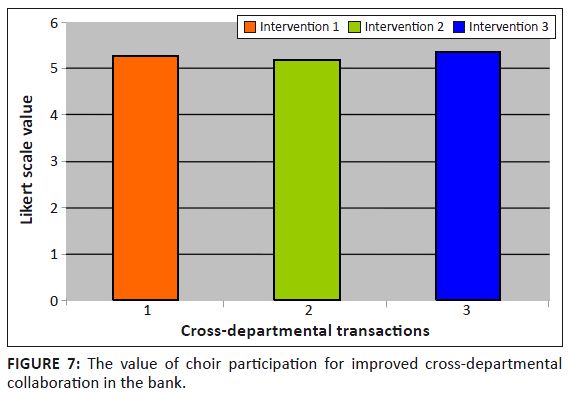 causes a reduction in unethical behaviour which, in turn, reduces transaction cost.• Potential choir members are influenced to develop enough trust to join (or form links with) the choir. • Learning to trust fellow choir members enables participants to trust members of the broader society. Hence, choirs even benefit non-participants. Figure 7 presents respondents’ views on the influence of relationships developed in the choirs on cross-departmental transactions in the bank (factor 5). The average mean of the three interventions for factor 5 (m = 5.21) indicates that respondents found their choral participation beneficial to cross-departmental business in the bank. Putnam deems social capital a powerful resource as it facilitates cooperation. He regards the simple feat of associating together as the catalyst that spurs the social cooperation which makes democracy feasible: ‘Good government in Italy is a by-product of singing-groups and soccer clubs …’ (Putnam 1993:176).