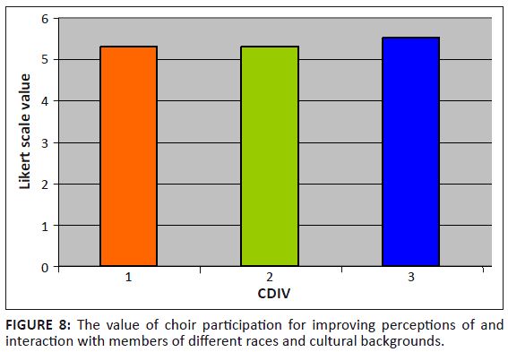 After participating in an inter-university HIV-AIDS project in Lesotho where choral singing formed an integral part of the work, Deanna5, a post-graduate student from Empire College (State University of New York) commented in this regard: Learning and performing music from other cultures allows the student to have an internal visceral experience with the languages and values of those cultures. This experience is unique because it internalizes this new cultural information before it can be analyzed or critiqued. Attempts at cultural understanding become more meaningful when this personal experience is considered, as the gap between self and other is bridged through the power of the song (Bergdorf pers. comm., 12 July 2008). The AICC survey indicated that, through singing together in an Absa choir, respondents experienced increased respect for other South African cultures and races. Mutual respect permits disclosure of self to the other. Comments from the open-ended questions include: ‘In our choir we have overcome racism’; ‘I now want to learn a Black language’ and ‘We are not so different – we are one’. This is confirmed by the quantitative data. Intervention 3, took place during the fourth AICC. At the time some employees had been singing together for four years. The particularly high score of 5.53 (out of a maximum of 6) given by these participants indicates that prolonged exposure to others in the choir impacted the nurturing of respect for the other and his or her culture favourably. From a Christian perspective, respect can be seen as the interpersonal capacity to see and respond to another as a unique and valuable creation of God. According to Grauf-Grounds et al. (2008) respect visualises that God as Creator has purpose and meaning entrenched in the lives of each of God’s creatures. Each person has worth and dignity that we can respond to and encourage within our interactions as well as within relationships (Grauf-Grounds et al. 2008). In this regard, it is clear that the AICC had a positive impact on the way in which participants valued and respected one another’s worth. Jeannotte (2003) states: If much of what we are and who we become is governed not only by shared meanings but also by how these shared meanings influence our relations with others, ‘singing together’ … may hold benefits not only for oneself, but also for the people around us. Indeed, this singing may be a transformative experience and one of the key elements of a sustainable Community. (p. 35)