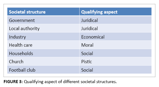 The Triple I model also presupposes the theory of individuality structures (Dooyeweerd 1969, III). The theory of the modal aspects describes the different aspects in which things, wholes or concrete structures function. The theory of individuality structures describes the own nature or identity of these structures. Typical social structures in which human beings function and develop themselves are families, schools, employment, politics, entertainment and churches. All these structures have their own identity or individuality, as expressed by the so-called qualifying function: social, formative, economical, juridical, social or pistical. In all these social structures technology will function adequately only when is it disclosed under the guidance of the quality function of the structure (see Figure 3). For example, internet portals in sales have to be disclosed under the guidance of the economic qualifying function, whereas internet portals in healthcare are underpinned by the moral qualifying function. The theory of the individuality structures is required to help engineers understand the nature and character of the context in which technology is used. It is also required to understand that the identity of technology is not determined by technology itself but by the nature of the societal structure in which it functions. (Verkerk et al. 2007:118–122).