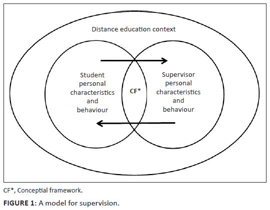 From the above, it is clear that there is a reciprocal relationship between the personal characteristics and the behaviour of both the student and the supervisor in the relevant context, for example, a DE environment. This relationship is dynamic and can change over the period of the study. Diagrammatically, this can be depicted as follows. In Figure 1, the personal characteristics of the students include their abilities (such as language ability), previous knowledge and experience, cultural beliefs, beliefs about the role and responsibilities of supervisors and students, and research SE. The personal characteristics of the supervisor include knowledge and experience in research and supervision in particular and beliefs about the role and responsibilities of supervisors and students. These beliefs determine their supervisory style as power-centred or facilitation-centred. This is in line with postmodern thinking that truth is relative to participants’ frame of reference.