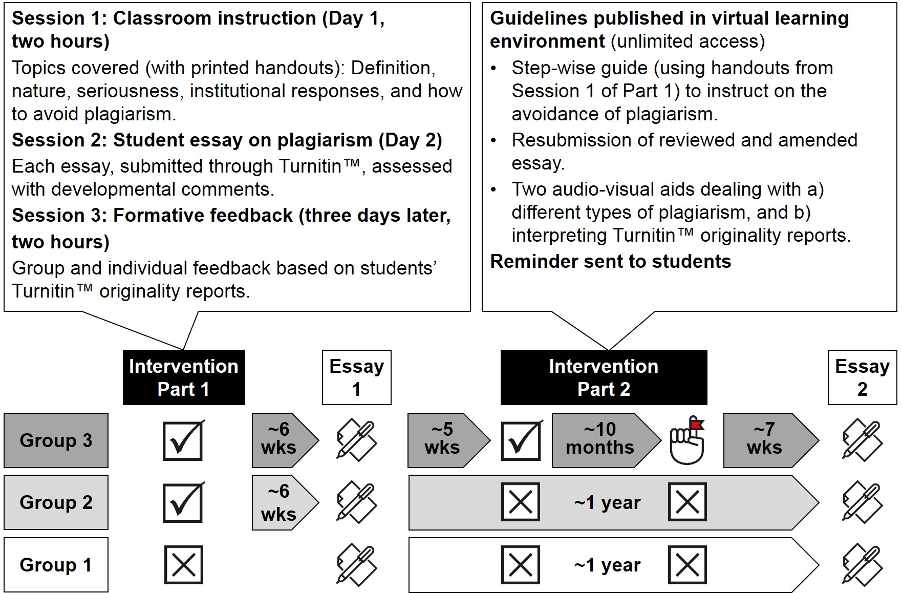 The aim of the study was to investigate whether an intervention to address post-graduate student plagiarism in an Honours programme in Human Resource Management at a South African university had an impact one-year later. In a quasi-experimental design, the sample comprised 34 students in a control group and 70 students in two intervention groups. Student essays were examined for different types of plagiarism at two different times and compared by means of Wilcoxon Signed-Rank and Kruskal-Wallis tests. Findings indicate that students who were exposed to both parts of an intervention evidenced less plagiarism in their essays one year later than those who were exposed to only one part of the intervention or no intervention at all.